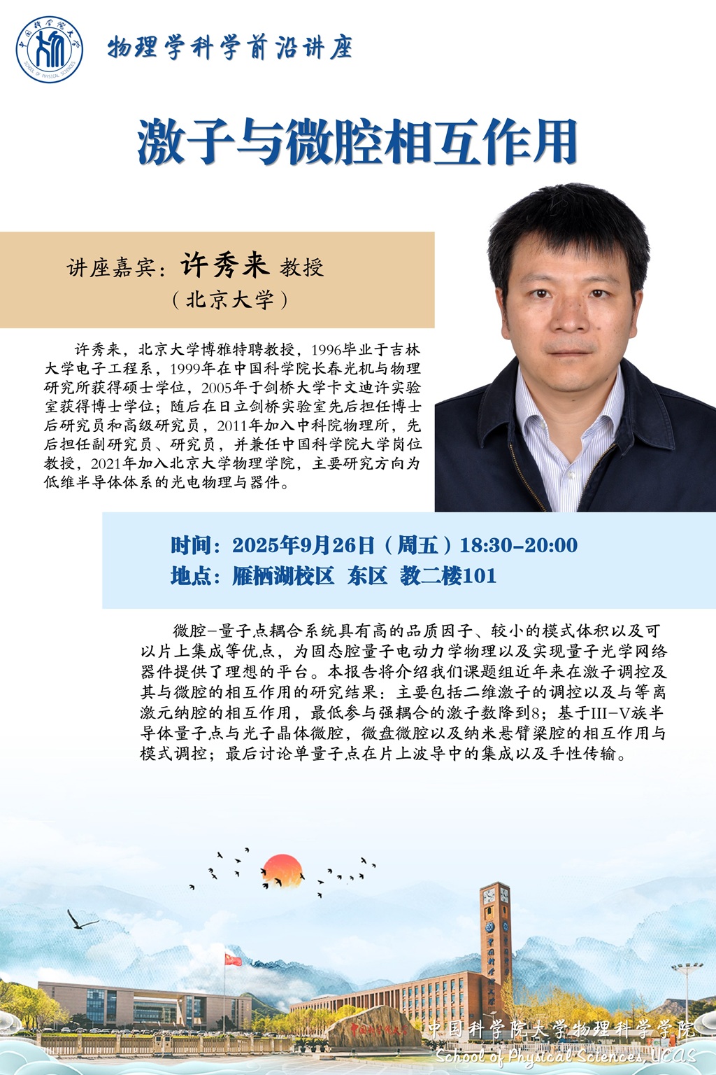 地点:雁栖湖校区 教二楼101主讲人:许秀来 教授(北京大学)联系人:物理学院联系方式:69671664开始时间:2025-09-26 18:30:00结束时间:2025-09-26 20:00:00内容: