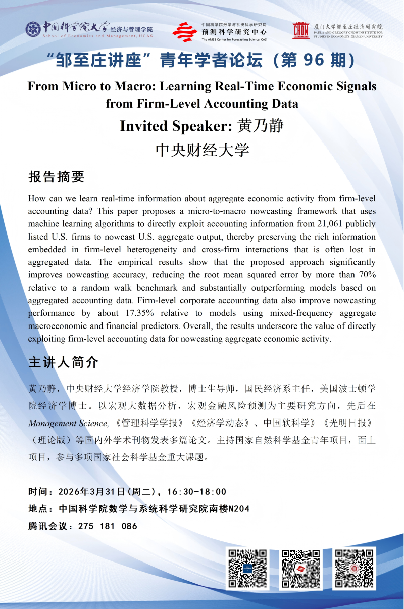 地点:中国科学院数学与系统科学研究院南楼N204 腾讯会议:275 181 086主讲人:黄乃静联系人:经管学院联系方式:01082680913开始时间:2026-03-31 16:30:00结束时间:2026-03-31 18:00:00内容:
